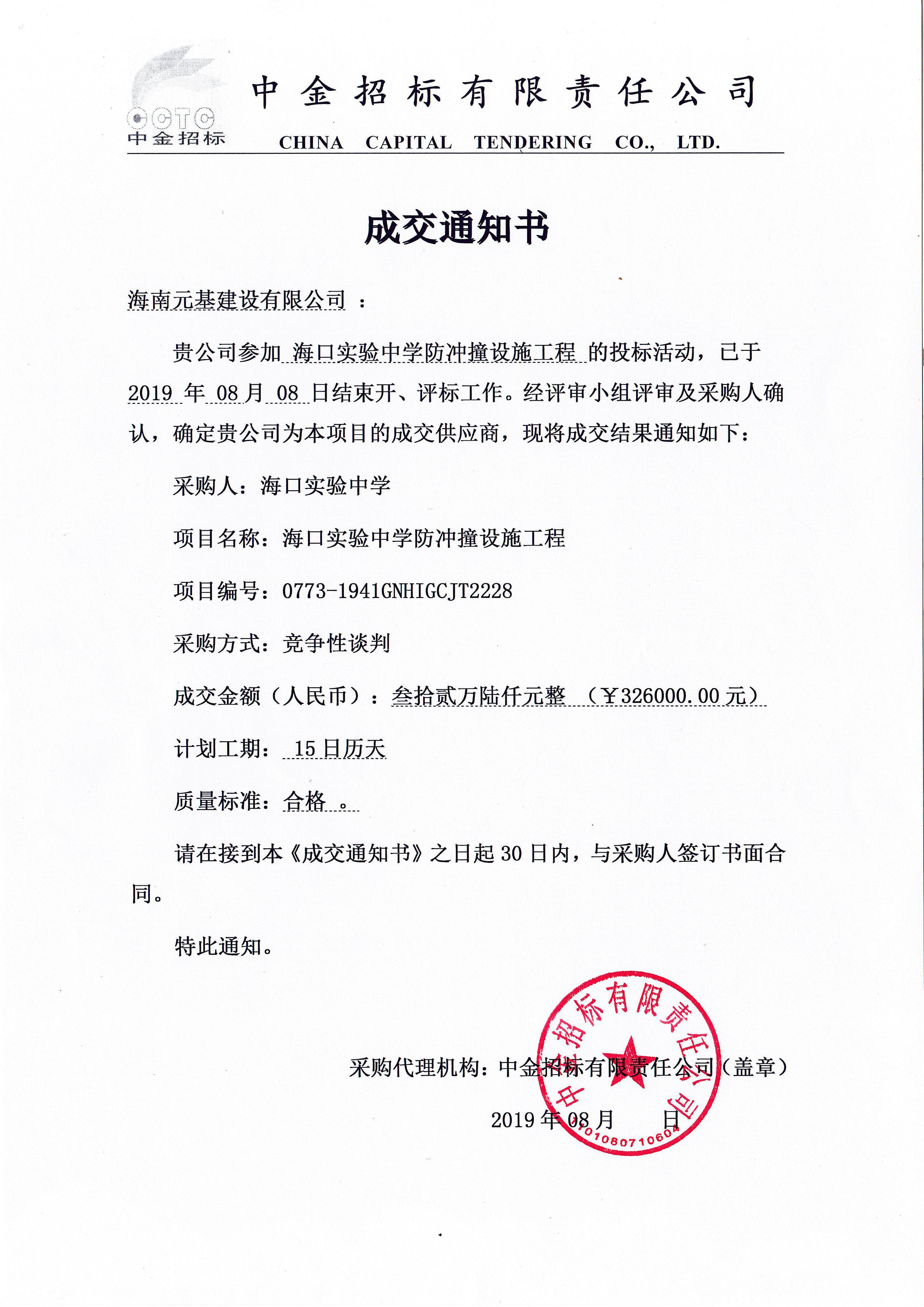 2019年8月8日,海南元基建設(shè)有限公司中標(biāo)??谑袑?shí)驗(yàn)中學(xué)防撞沖設(shè)施工程項(xiàng)目,中標(biāo)金額32600.00元,計(jì)劃工期15日歷天,我司于2019年8月6日購(gòu)買標(biāo)書,8月7日完成全部投標(biāo)文件,8月8日在??谑兴{(lán)天路12號(hào)國(guó)機(jī)中洋公館2棟601室開標(biāo),其評(píng)標(biāo)結(jié)果為我司為中標(biāo)人。